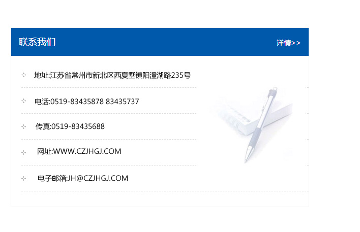 地址:常州市新北區友邦商務大廈1幢16、17層  電話:0519-85101652  傳真:0519-85112595  郵編:213022  網址:www_cz-jiayue_cn.86153631.com  郵箱:xiajifengaa@163.com